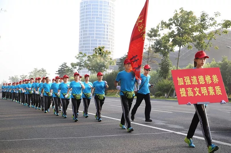 开幕式后,徒步走活动正式开始。健身爱好者们热情高涨,踏着音乐,踩着节拍,健步前行,从体育场南门出发,沿着北京路、吉林大道、上海路前行,全程3.5公里,途经沧州游泳馆、渤海酒店、市民服务中心、博物馆、规划馆、图书馆、沧州国际会议中心等狮城地标性建筑。15支队伍身着不同颜色的服装,一路上神采奕奕,精神饱满,夺目的服装、醒目的标语、整齐的口号、矫健的步伐,吸引了广大群众的目光。